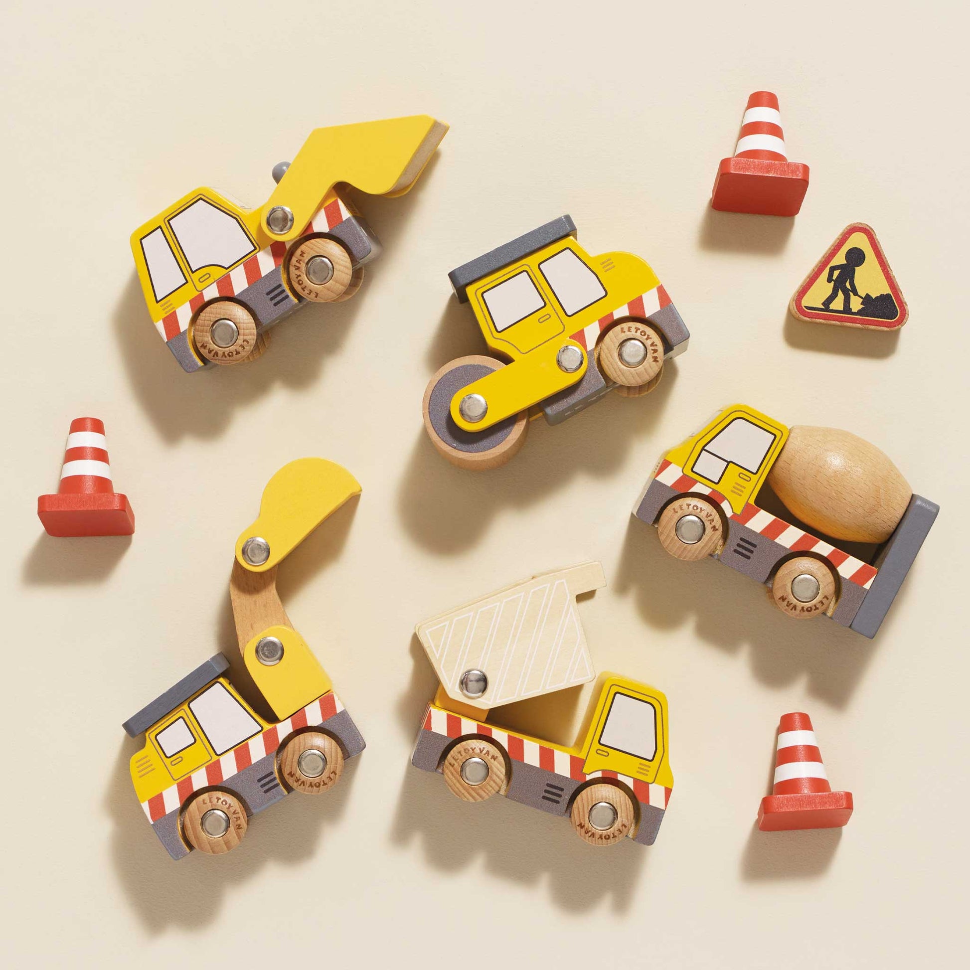 Budding builders are sure to love thi best-selling construction set, a lovely plastic free toy for eco-friendly play. Take imaginations off to new adventures with this 9 piece toy which includes a digger, cement mixer, dump truck, roller, front loader, cones and road works sign. Each vehicle is made from FSC ® - certified wood with wooden wheels and features a moving part for realistic play possibilities. Compatible with our standard train tracks and garages.