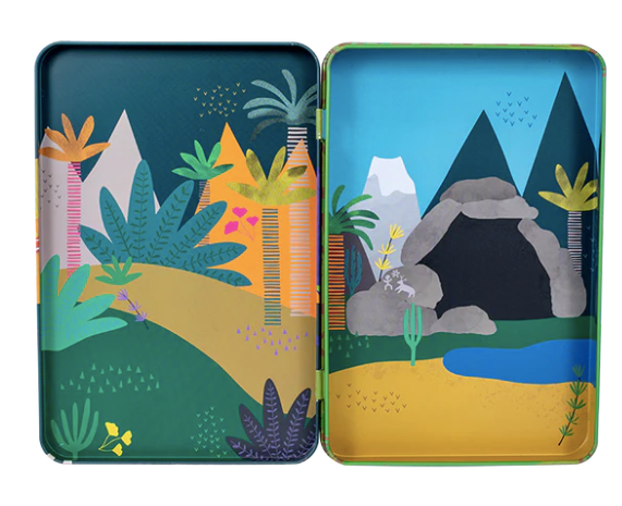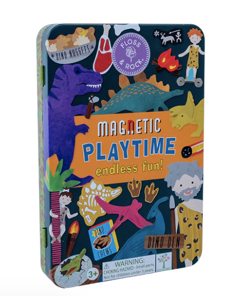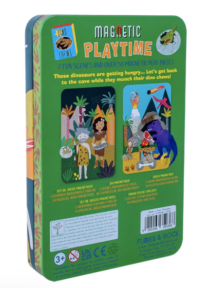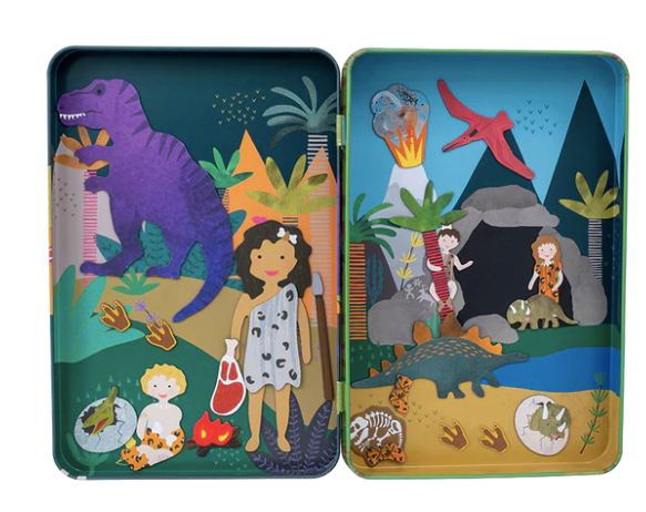 Playtime fun in a handy magnetic tin! Contains 3 sheets of pop out magnets so you can have fun sticking over 50 bright, fun magnetic pieces to the 2 fun scenes on the inside of your tin and let your imagination run wild creating fabulous pictures with dinosaurs, cavemen, volcanos, fossils and much more.