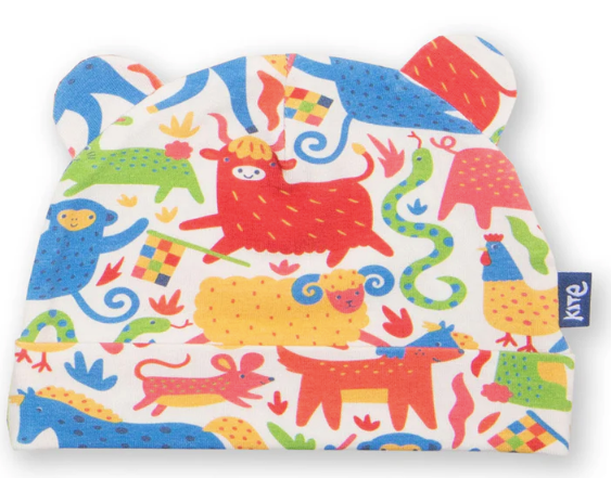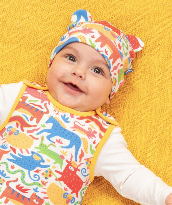 Keep your little one snug and cosy with this perfect organic cotton hat. Featuring the colourful Lunar Race print with a turn-up and cute ears. Complete the look with the matching range for an adorable outfit this season.