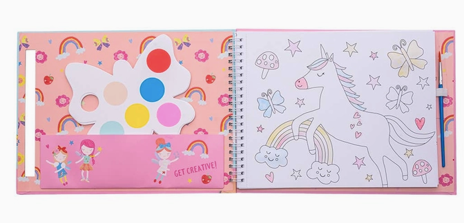 Spiral bound paint pad includes 8 individual paint palettes shaped as a butterfly, 8 gorgeous tear out pictures and a paint brush. Simply add a small amount of water onto your brush, swipe across the paint colour on the palette and then paint your masterpiece! The paint palettes and brush are securely stored within the pad when not in use making it perfect for painting on the go!
