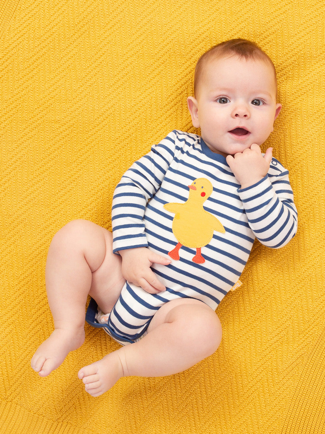 A stand-out sweet little number! These beautiful bodysuits are wonderfully soft and comfy, making them perfect for every day. This long-sleeved, yarn dyed stripe baby vest with an adorable duck appliqué looks great worn as a t-shirt or with the coordinating knit leggings. The handy shoulder popper opening makes change time easy peasy.